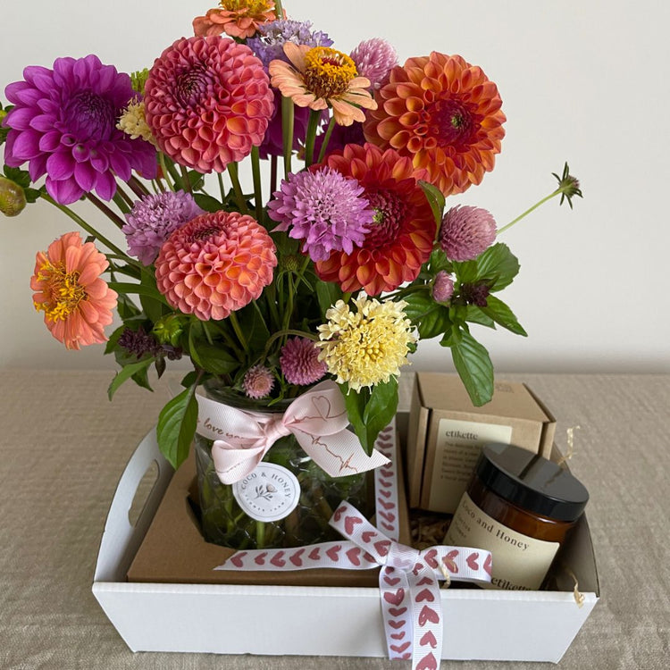 Our arrangements are completed with a beautiful ribbon to compliment the blooms. We include floral preservative and a care tag, unique to Coco and Honey Flower Farm to help you to (get the best vase life possible from our flowers. Note cards are available to be attached to arrangements to relay a message from you to the special person who you are sending flowers to. Plain note cards are complimentary, or hand painted floral inspired watercolour cards are available to purchase.