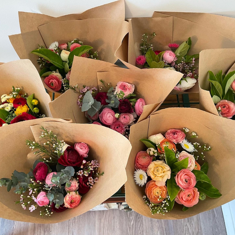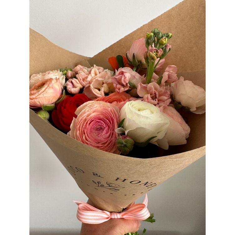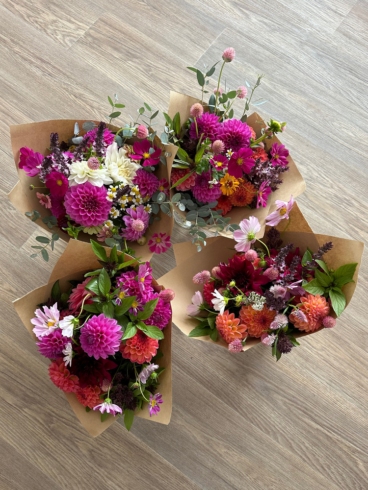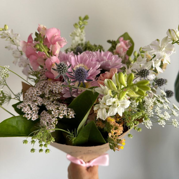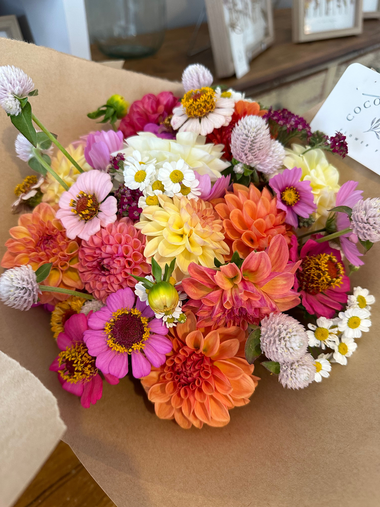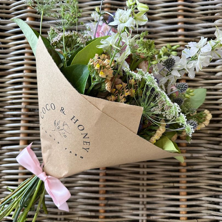 A selection of our freshly picked seasonal blooms, straight from the farm, hand tied into a small bunch wrapped in our signature stamped, brown craft paper.