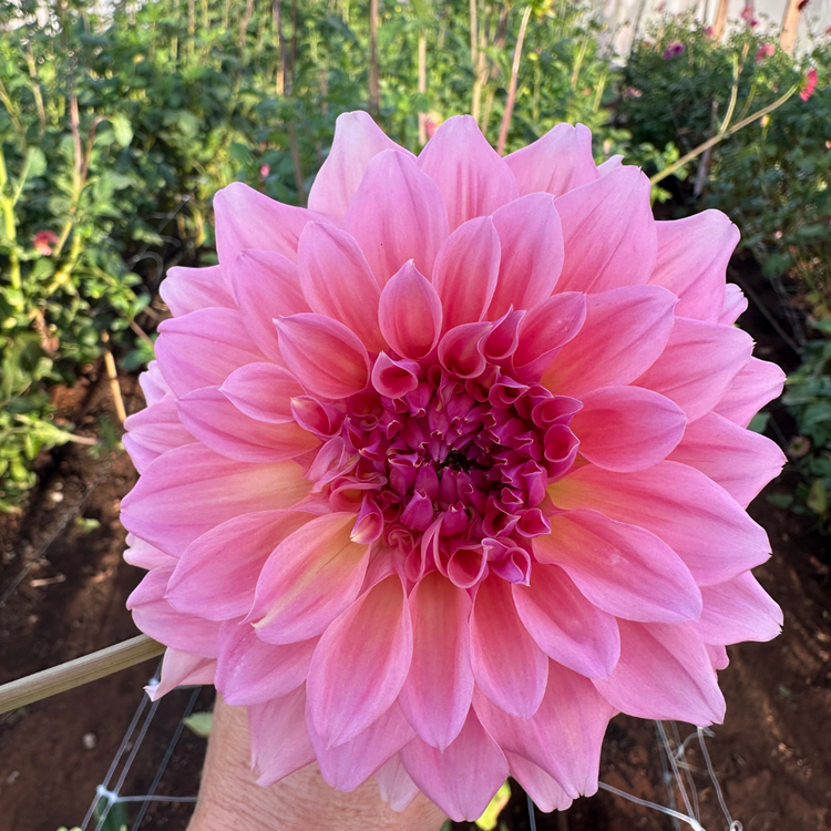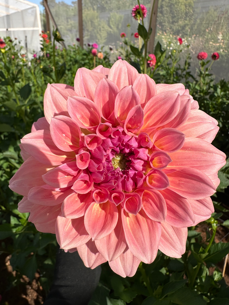 Large decorative peach with muted pink tones. Changes to a dusty pink as the season progresses in our farm. Beautiful for weddings and highly sought after dahlia variety.