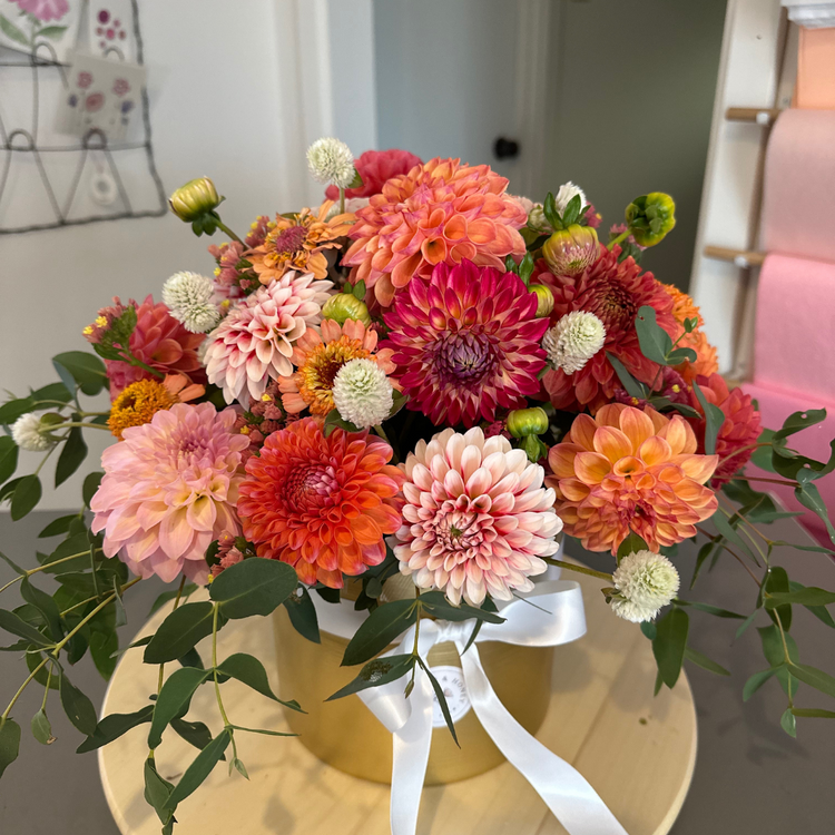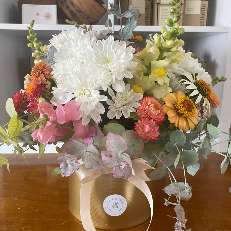 Featuring a contemporary, matte-gold metal cylinder, densely filled with a posy style arrangement of seasonal blooms with a harmonious colour palette. The metal cylinder can be re-purposed as an elegant pot for a plant for your home. This offers a bigger and more luxurious version of our Pretty Posy arrangement.