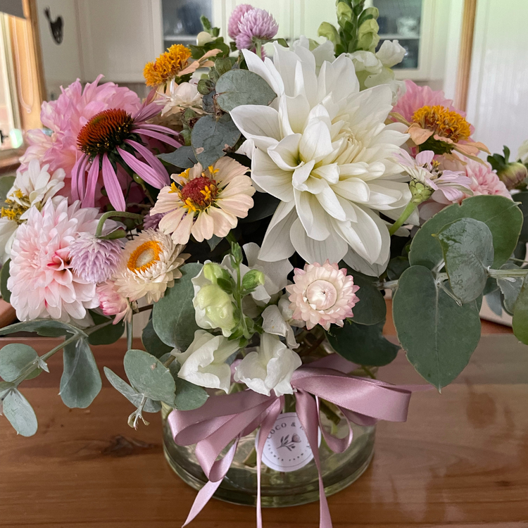 Our arrangements are completed with a beautiful ribbon to compliment the blooms. We include care instructions with our arrangements , unique to Coco and Honey Flower Farm to help you to get the best vase life possible from our flowers. Note cards are available to be attached to arrangements to relay a message from you to the special person who you are sending flowers to. Plain note cards are complimentary, or floral note cards with envelope are available to purchase.